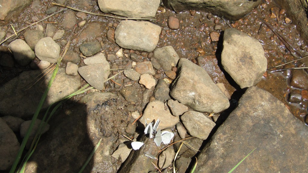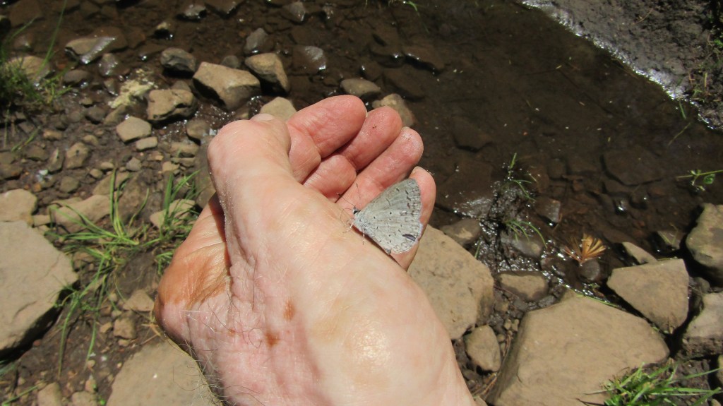 One annual hike is Woods Canyon Lake east of Payson. It is best known for the hike around the lake, but the best part is the hike following the stream below the dam. About a mile in I came upon a cluster of Western Azure butterflies. There must have been about a hundred in this one spot that crossed the creek. These butterflies were about the size of a dime. They were bright purple when they flew, but appeared to be white when they landed. One of them landed on my hand so I took the photo with my other hand. Maybe I am ambidextrous.