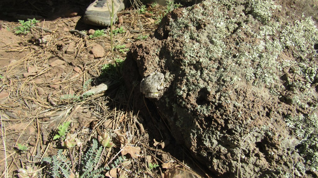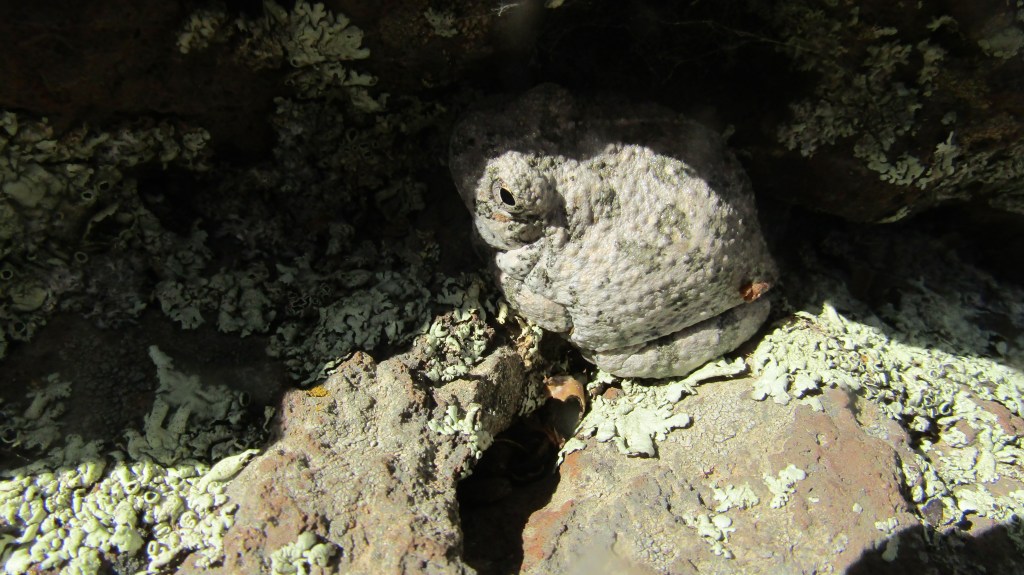 I was walking around Mingus Lake and a couple was fishing. I asked them if they had seen any frogs. They said “there’s one on the rock behind you.” I thought they were goofing on me, but I looked at the boulder and there it was: Beautiful. Up at 7,550 feet. It was a Canyon Tree Frog. Mingus Lake is small and is just big enough to be classified as a lake, but it is stocked with catfish and at this altitude it is a great place for a summer getaway.
